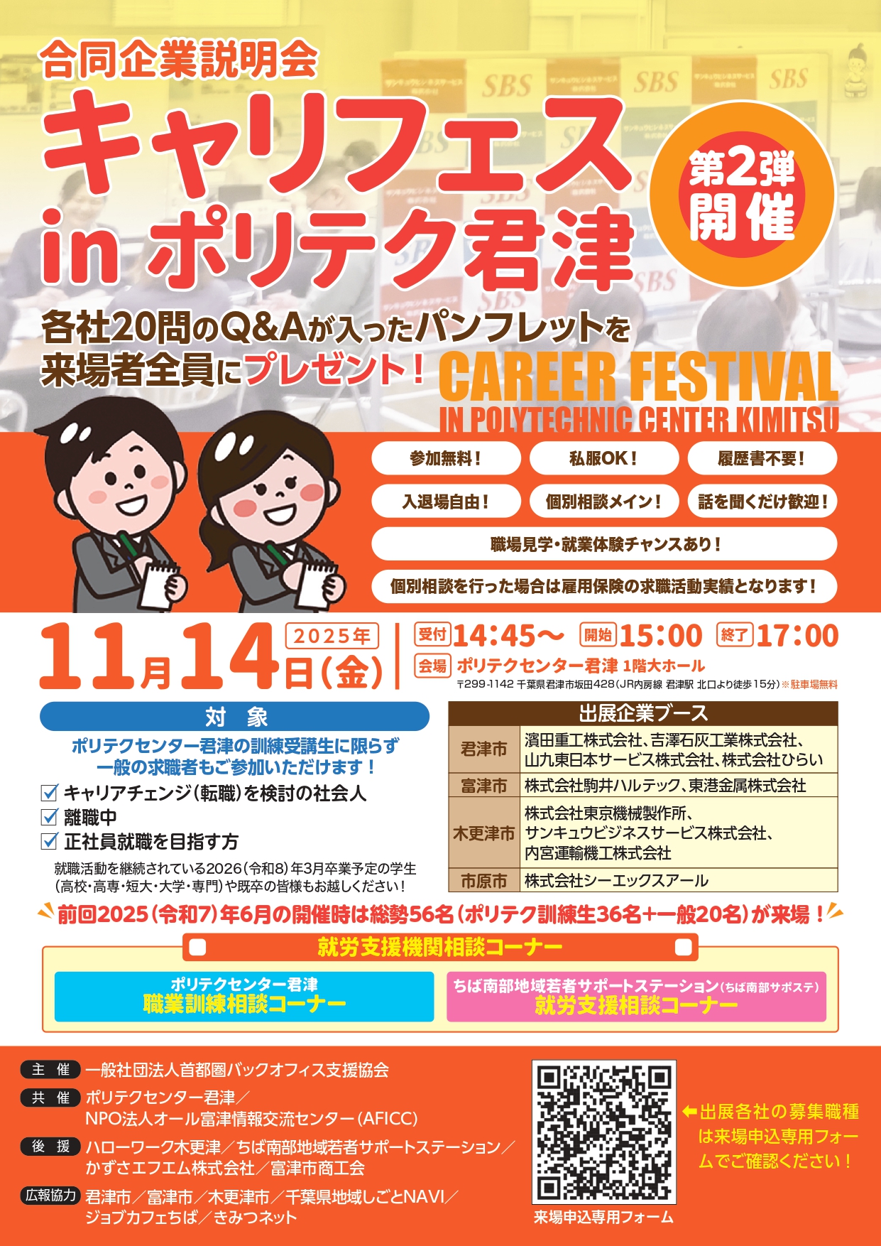 11月14日(金)に君津市坂田の「ポリテクセンター君津」にて、合同企業説明会「キャリフェスinポリテク君津」第2弾が開催されます。
