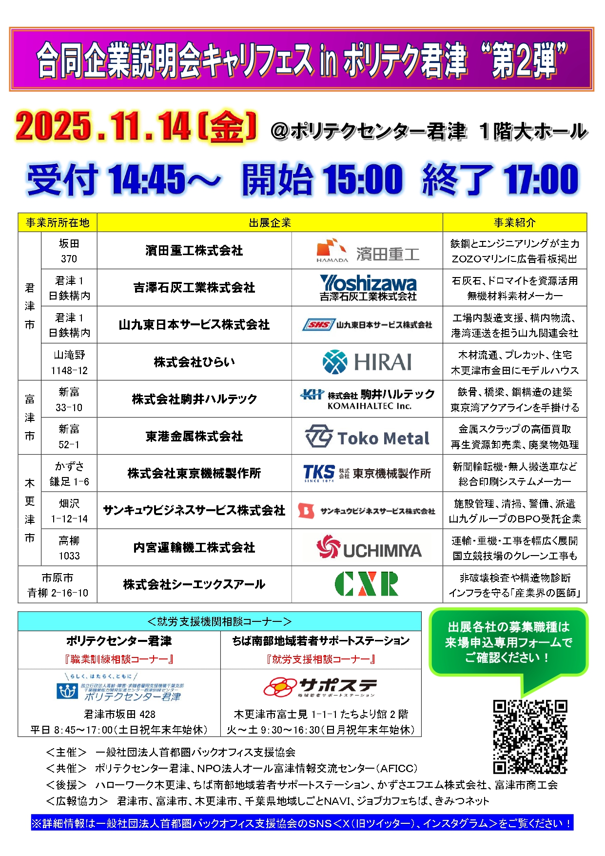 合同企業説明会「キャリフェスinポリテク君津」11月14日開催